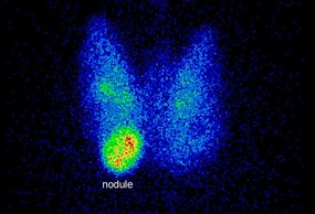 Hyperthyroidism can also result from thyroid nodules. These are lumps that develop inside the thyroid and sometimes begin producing thyroid hormones. Large lumps may create a noticeable goiter. Smaller lumps can be detected with ultrasound. A thyroid uptake and scan can tell if the lump is producing too much thyroid hormone.